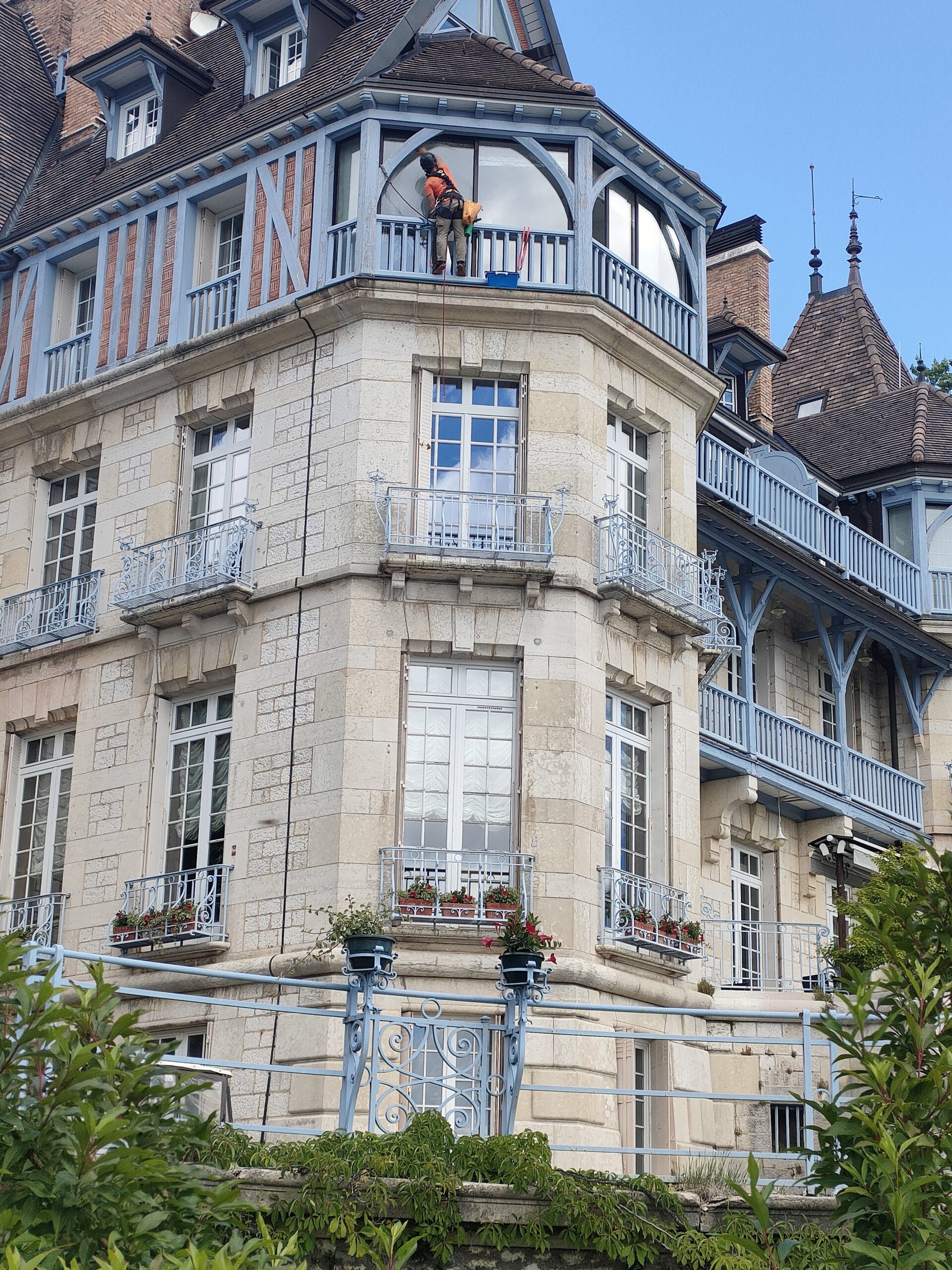 Grâce au travail sur cordes, nous accédons facilement aux zones difficiles ou impossibles à atteindre sans échafaudage. Cette méthode réduit les contraintes sur site tout en assurant une intervention propre, rapide et parfaitement maîtrisée.